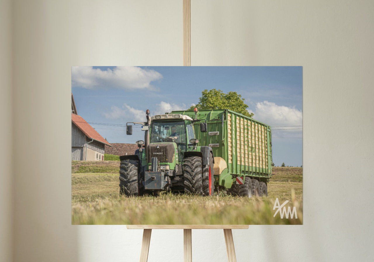 Diese Leinwand (60 × 40 cm) zeigt einen echten Klassiker-Traktor bei der Grasernte mit großem Anhänger – eine Hommage an die Zeiten, als Landtechnik noch pure Mechanik war.